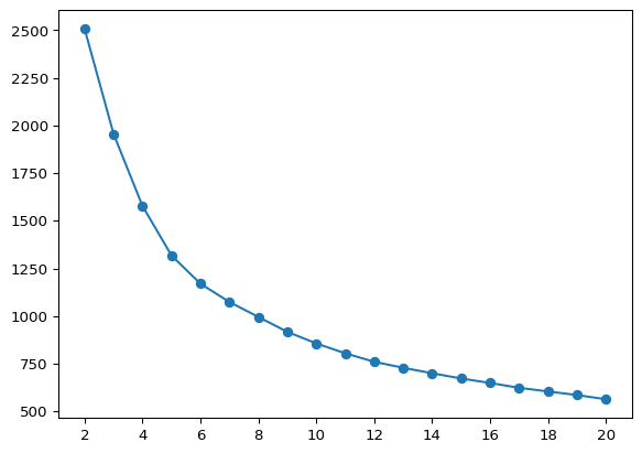 plt.plot(range(2, 21), inertia, marker = 'o')