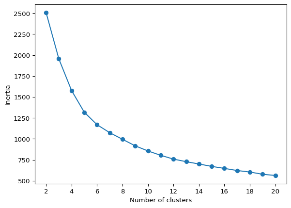 The helper function elbow_plot takes as arguments the standardized data and the maximum number of clusters, max_clusters (default 20), as well as some arguments to customize the K-Means algorithm (e.g., init, n_init, random_state). We illustrate this below.