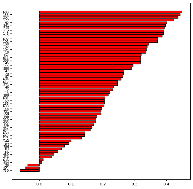 These arrays are passed to the barh plot with y as the sequence of IDs and width as the actual value of the silhouette score, in a bare bones graph.