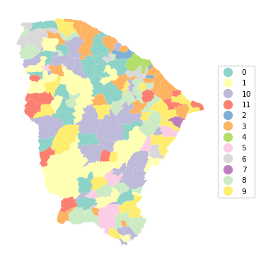 The clusters are not identical to the solution obtained with GeoDa, but the results are close. The fit is quite good, with a BSS/TSS ratio of 0.683. However, there is very little spatial clustering. Cluster 4 is the only one that turns out to be spatially contiguous, consisting of 4 municípios surrounding the main city of Fortaleza. However, in contrast, for cluster 7, which also consists of 4 units, the four entities are totally disconnected in space.