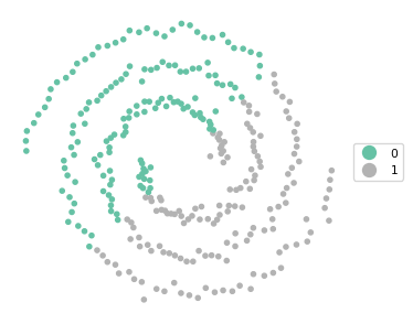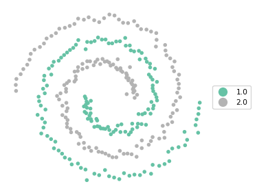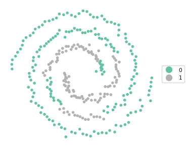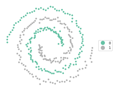 These settings yield a perfectly balanced set of clusters that is able to identify the two spirals exactly.